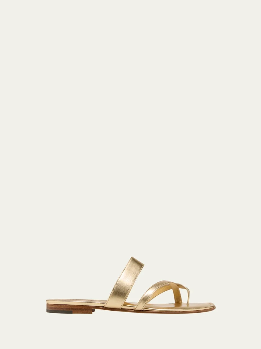 Manolo Blahnik metallic leather flat sandal. Flat stacked heel. Thong strap with crisscross bands over vamp. Thick strap across upper. Lightly padded footbed. "Susa" is made in Italy.