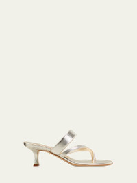 Manolo Blahnik "Susa" metallic leather mule sandals. 2" flared kitten heel. Crisscross toe straps. Mid vamp band. Slide style. Leather lining and sole. Made in Italy.