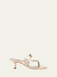 Manolo Blahnik "Susa" sandals in metallic snakeskin 2.00 in / 50 mm covered kitten heel Open toe Thong strap with crisscross bands over vamp Thick strap across upper Slipon style Goat leather lining Leather outsole Made in Italy