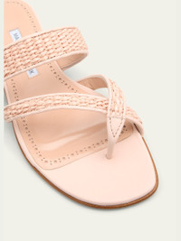 Manolo Blahnik "Susara" woven cotton and leather sandal. 0.25 in / 10 mm flat heel. Crisscross toe straps. Crossover mid-vamp strap. Slide style. Leather lining and sole. Made in Italy. Size Note: Item runs small, consider ordering a size up. Online Inquiries: BGS21_X6WQQ| Store Inquiries: #4810553