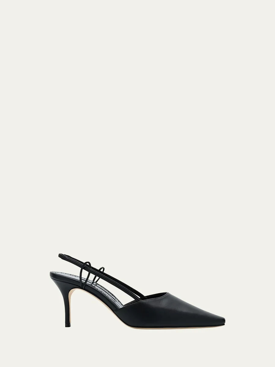 Manolo Blahnik "Touki" pumps in smooth leather 2.75 in / 70 mm stiletto heel Pointed toe Elastic slingback strap Goat leather lining Leather outsole Made in Italy Online Inquiries: BGS21_X6ZEB| Store Inquiries: #5070364