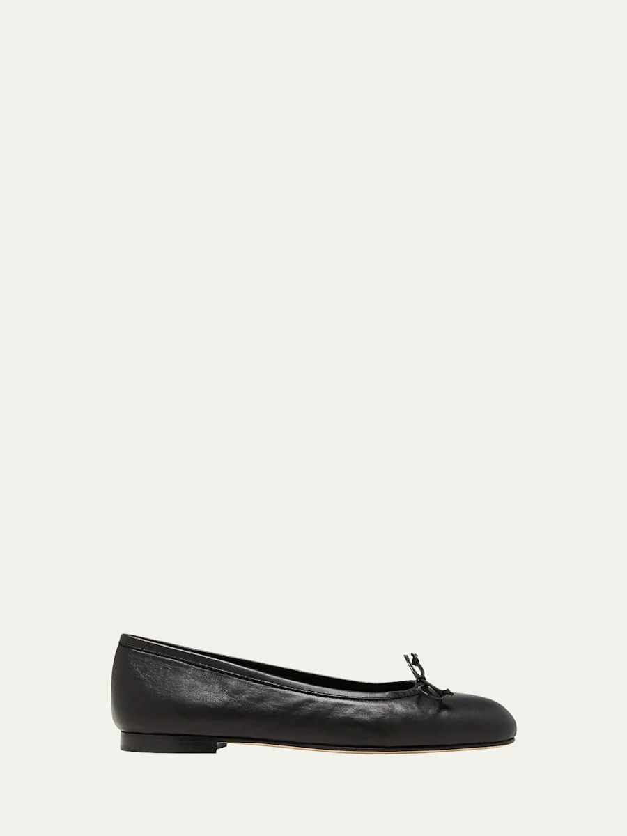 Manolo Blahnik "Veralli" soft leather ballerina flats with bow accent 0.25 in / 10 mm flat heel Round toe Slipon style Leather outsole Lining: Leather Made in Italy