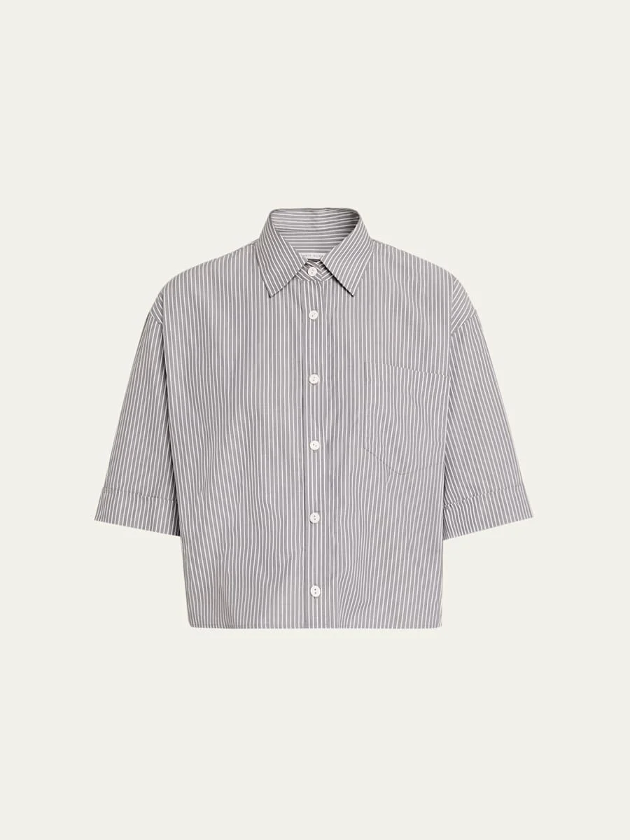 MARIA MCMANUS oversized shirt in a classic pinstripe print framed with cuffed sleeves Approx. 21.3"L from shoulder to hem Shirt collar; button front Elbow-length sleeves Chest patch pocket Yoked back Cropped hem Organic cotton Made in Portugal Online Inquiries: BGS21_BA4ZK| Store Inquiries: #5037571