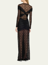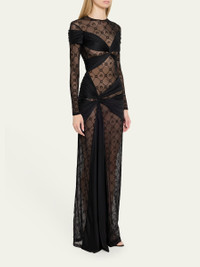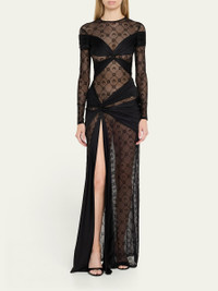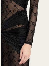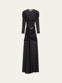 Marine Serre moonogram mesh jersey dress with cutout draping and pleating detail Jewel neckline Long sleeves Floor length Sheath silhouette Thigh-high slit Nylon/polyamide/elastane Made in Romania Online Inquiries: BGS21_B9N3G| Store Inquiries: #4921972