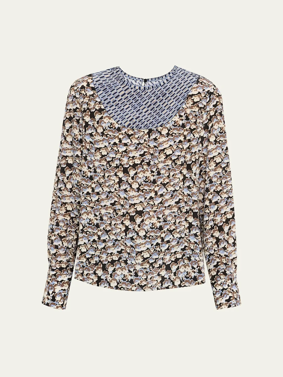 Anemone Floral Silk Crepe De Chine Long-Sleeve Blouse