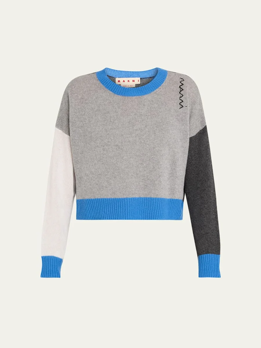 Marni colorblock sweater featuring a handmade embroidered logo on front left side Crew neckline Long sleeves Drop shoulders Boxy fit Ribbed cuffs and hem Pullover style Cashmere Dry clean Made in Italy Online Inquiries: BGS21_BA3KD| Store Inquiries: #5025394