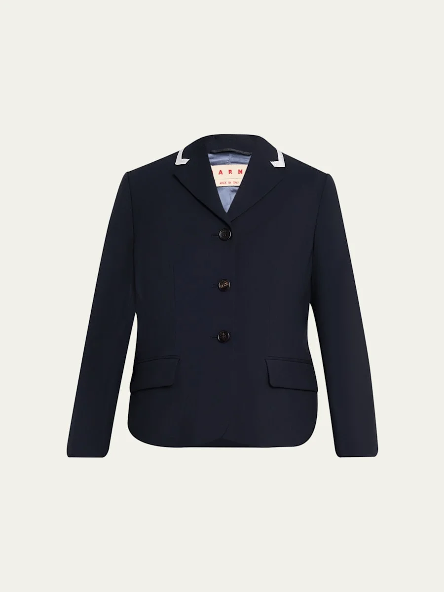 Crafted from wool tailoring, this blazer jacket from Marni features contrast grosgrain trim along the collar and a handembroidered logo on the cuff Notch lapels; singlebreasted front Long sleeves Hip flap pockets Straight fit Hip length Virgin wool Dry clean Made in Italy SIZE amp; FITModel measurements: 5'10" tall Model is wearing a US size 4/Small