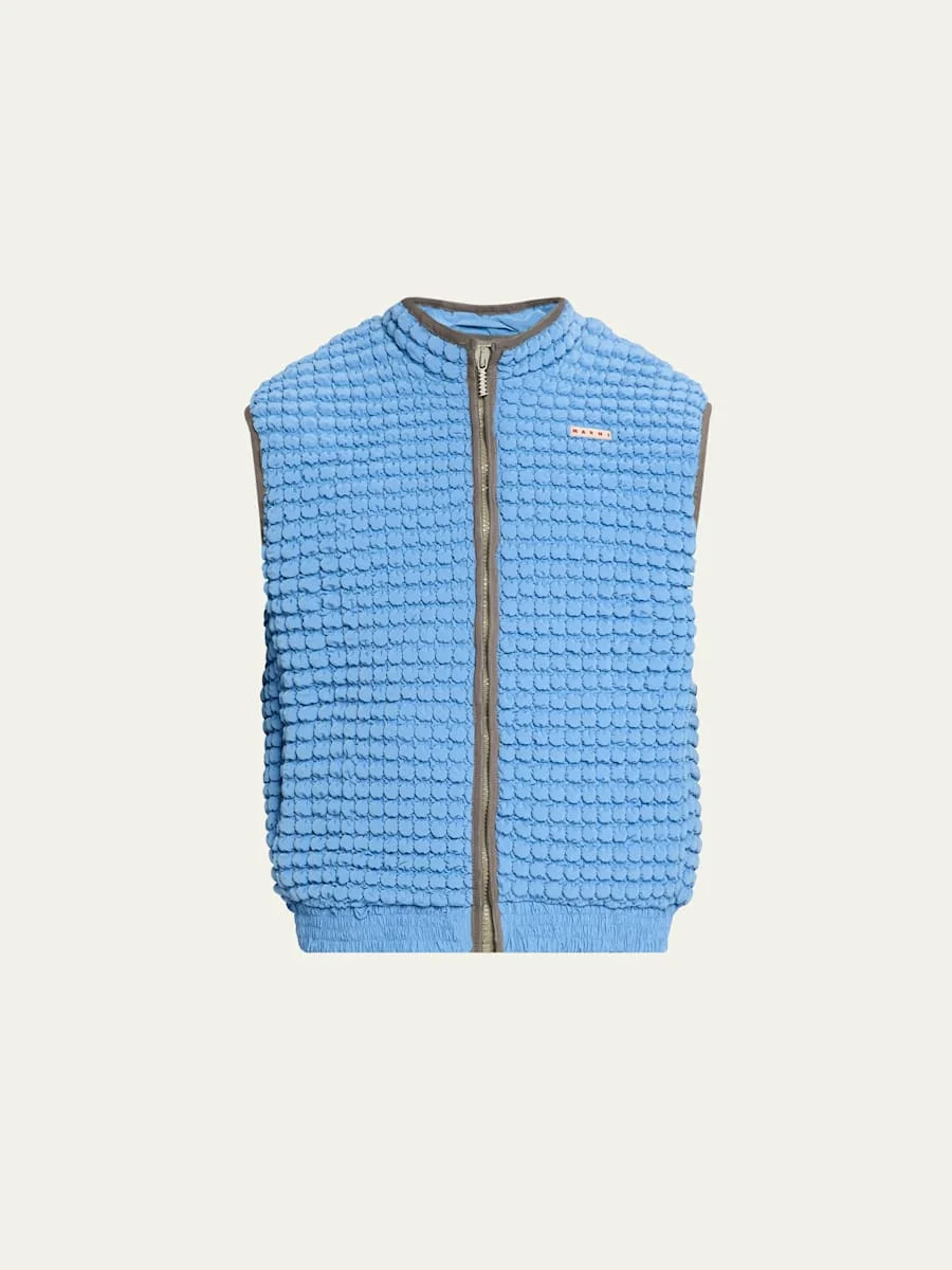 Marni vest defined by crinkled nylon with "pluriball" quilting for a distinctive finish Accented with contrast piping Lightly padded and lined Stand collar Embroidered chest logo Fullzip front Side seam pockets Sleeveless Banded armholes Ribbed hem Polyester/nylon/cotton Nylon lining Dry clean Made in Italy