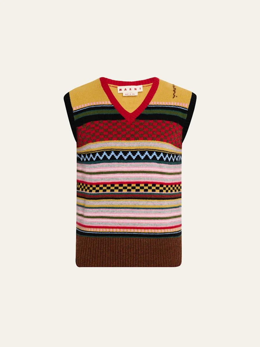 Marni vest showcasing a mixed print with the handembroidered logo on the shoulder Vneckline Sleeveless Ribbed armholes and hem Pullover style Regular fit Wool/cotton Dry clean Made in Italy