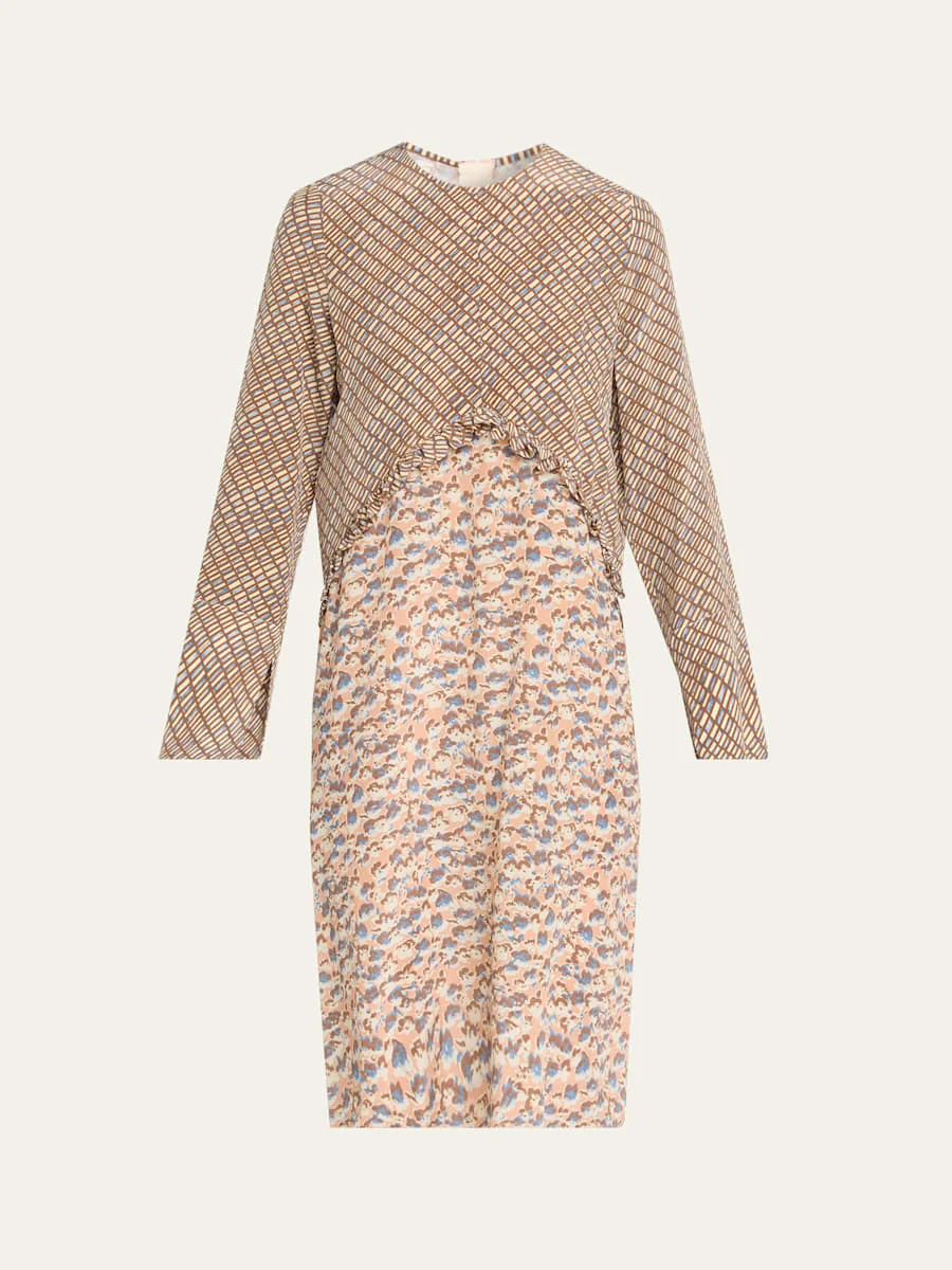 Mixed-Print Silk Long-Sleeve Empire Shift Dress