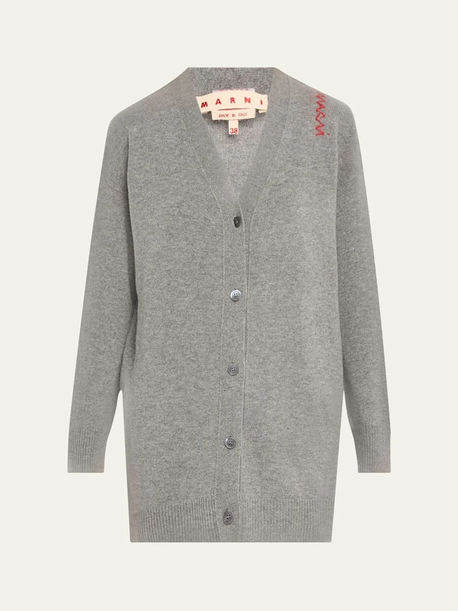 Marni knit cardigan with ribbed bottom and handmade embroidered logo on front left side V neckline; button front Long sleeves Oversized fit Virgin wool/cashmere Dry clean Made in Italy Online Inquiries: BGS21_B9MKN| Store Inquiries: #4915369