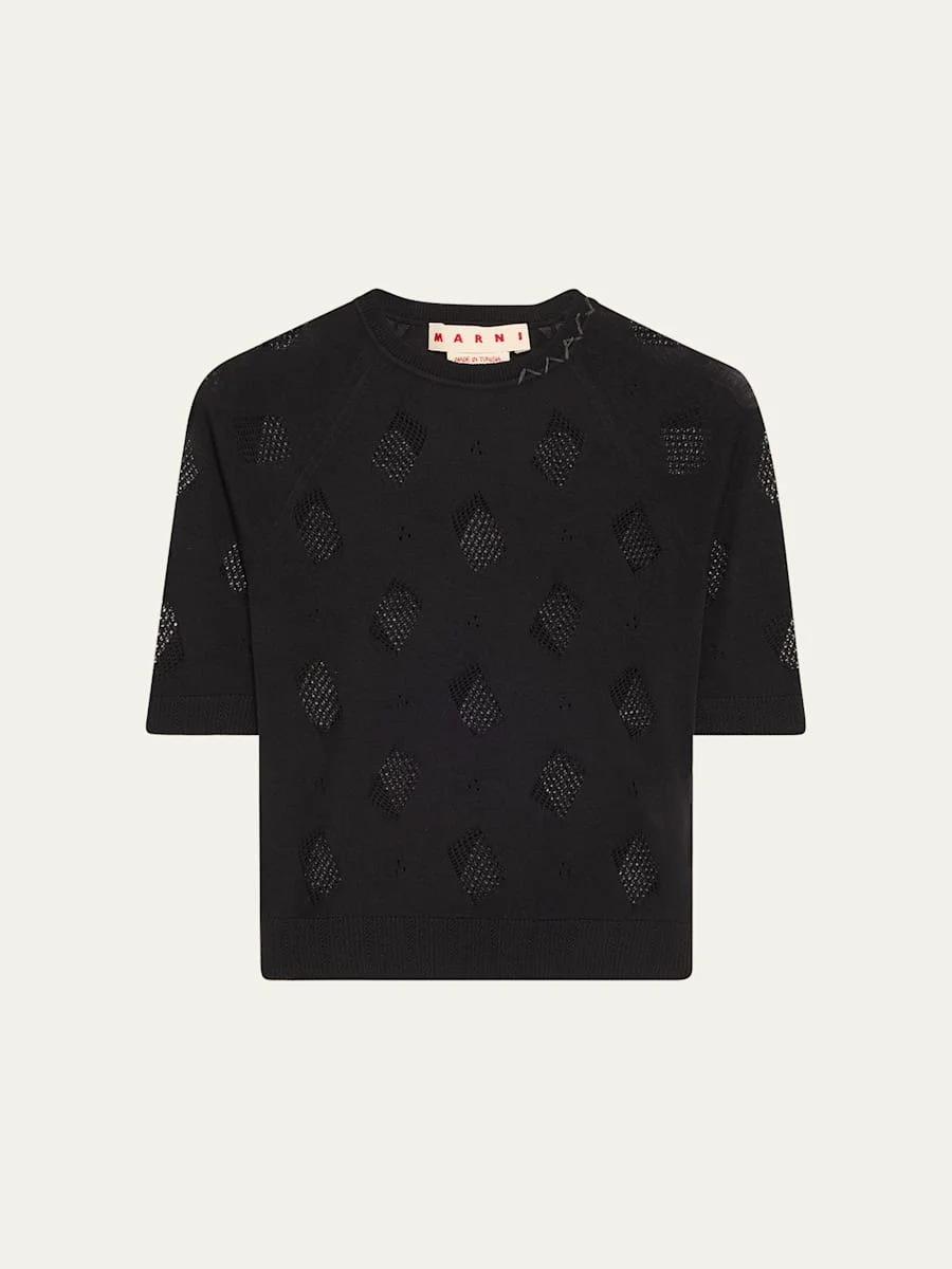 Marni perforated knit sweater fetauring a hand embroidered logo on the neck Crew neckline Short sleeves Slim fit Ribbed cuffs and hem Pullover style Virgin wool Made in Italy Online Inquiries: BGS21_B9WAJ| Store Inquiries: #4986695