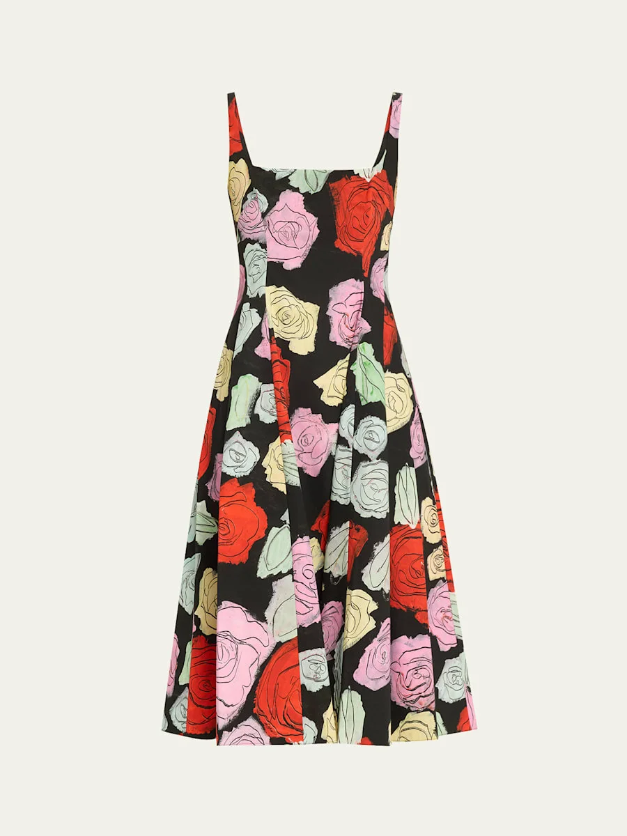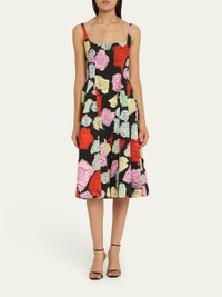 Sleeveless Rose-Print Cotton Poplin Midi Dress