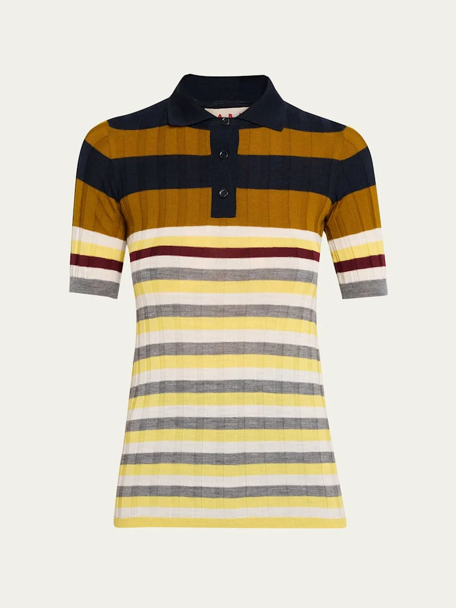 Marni wide ribbed knit polo top featuring a striped intarsia and handmade logo patch on the back Point collar; three-button front Short sleeves Fitted Ribbed cuffs and hem Pullover style Virgin wool Dry clean Made in Italy Online Inquiries: BGS21_BA3KM| Store Inquiries: #5025402