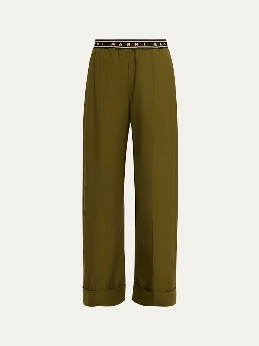 Crafted from woven wool suiting, these trousers from Marni feature a whipstitched logojacquard waistband, giving a sporty look, while pressed creases and turnup cuffs keep a railored silhouette Mid rise sits high on hip Angled side slip pockets Bakc welt pockets Straight legs Full length Rolled cuffs Pullon style Virgin wool Dry clean Made in Romania SIZE amp; FITModel measurements: 5'10" tall Model is wearing a US size 4/Small