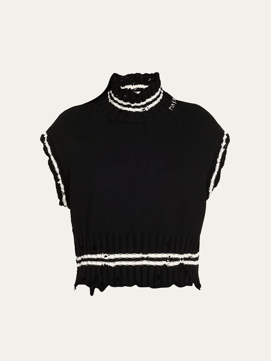 Marni sweater featuring distressed striped edges and hand-embroidered logo on the shoulder Turtleneck Sleeveless Boxy fit Ribbed cuffs and hem Pullover style Cotton Dry clean Made in Italy Online Inquiries: BGS21_BA3KC| Store Inquiries: #5025393