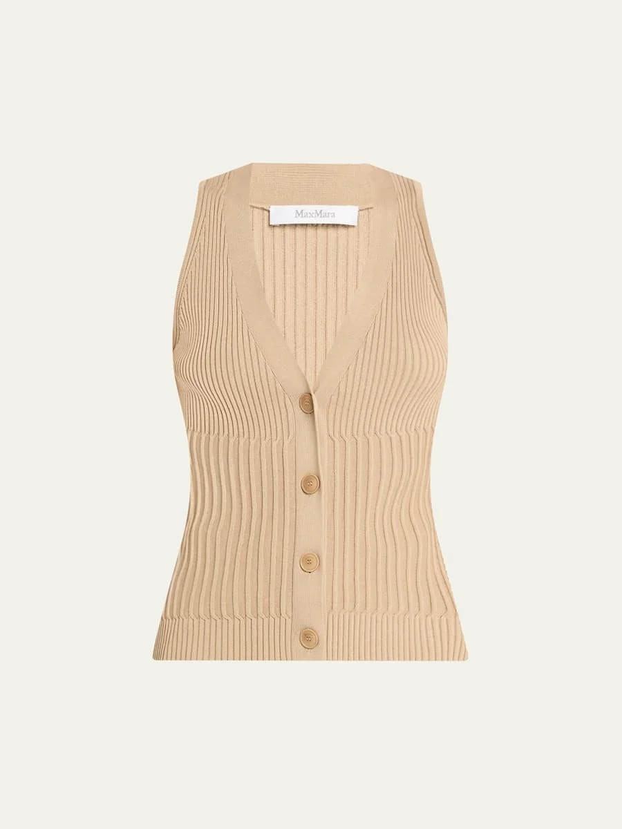 Max Mara "Bimba" rib-knit jersey vest V neckline Button closure Sleeveless Slim fit Cotton/viscose Hand wash Imported Online Inquiries: BGS21_BA42D| Store Inquiries: #5028472