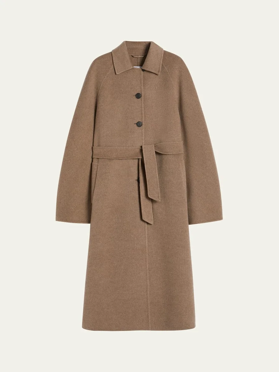Max Mara "Centro" coat is crafted from warm brushed cashmere and cinched at the waist with a self belt Point collar; single-breasted front Long raglan sleeves Rolled cuffs Self-tie belted waist Hip welt pockets A-line silhouette Hem falls below the knee Cashmere Dry clean Made in Italy Online Inquiries: BGS21_BABBX| Store Inquiries: #5072508
