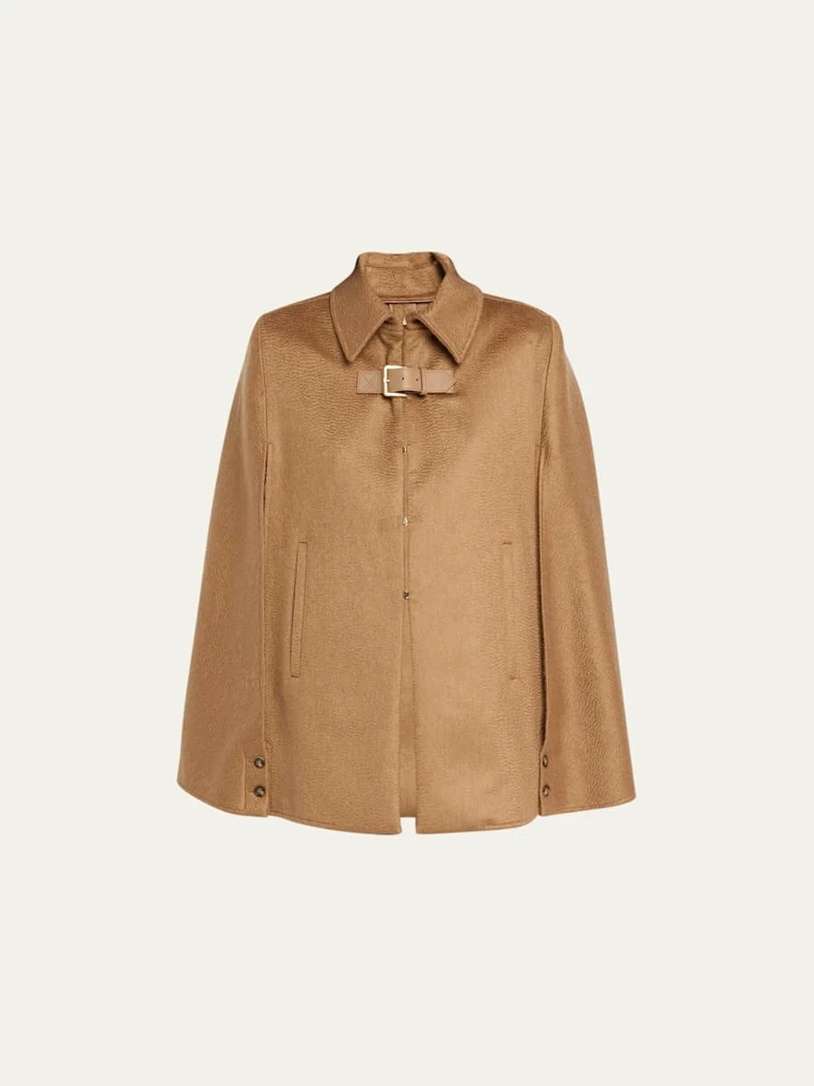 Max Mara "Obliqua" cape in virgin wool, cashmere, and leather Wing collar Adjustable frame buckle Hookeye closures Cape sleeves; buttons on cuffs Slip pockets Dry clean Made in Italy