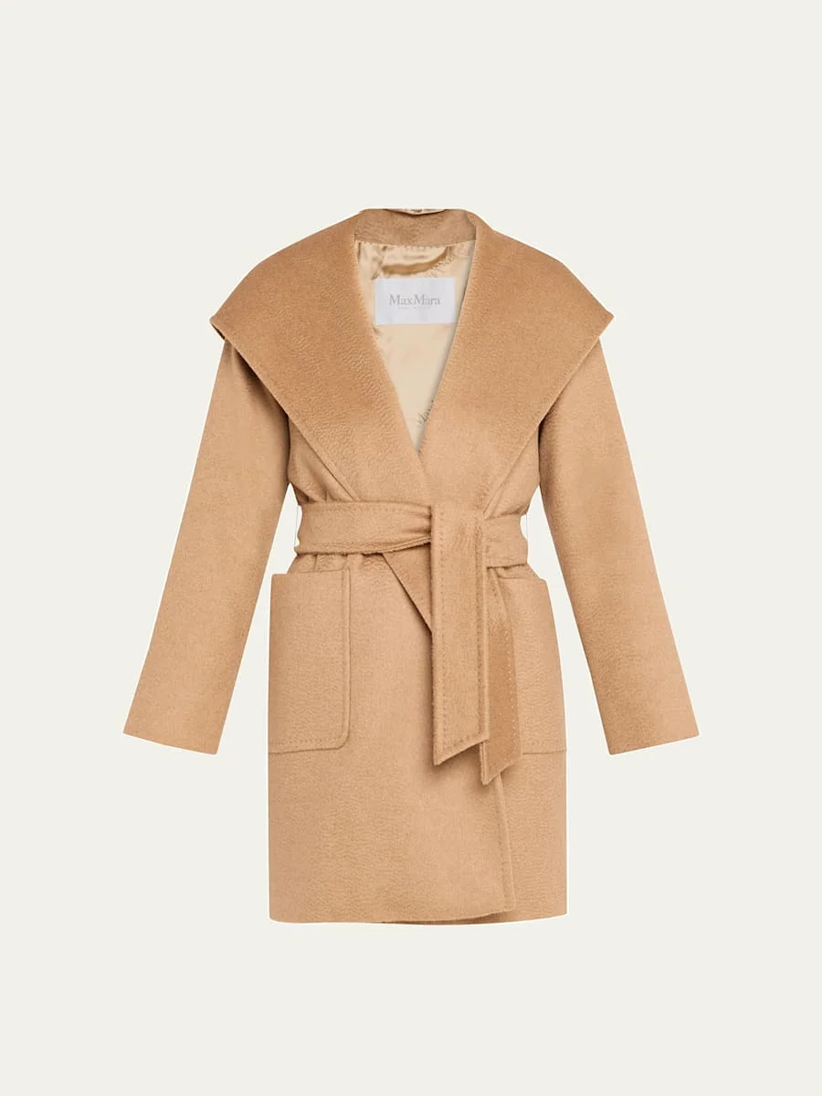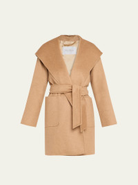 Maxmara "Rialto" coat in camel wool. Approx. length: 90cm. Shawl collar; open front. Hooded back. Long sleeves. Self-tie belt. Front patch pockets. Slim A-line silhouette. Mid-thigh length. Viscose lining. Care note: Professionally dry clean perchloroethylene - mild process; do not wet clean. Made in Italy. Model is 5'10"/177cm. Online Inquiries: BGS21_B4P69| Store Inquiries: #2818147