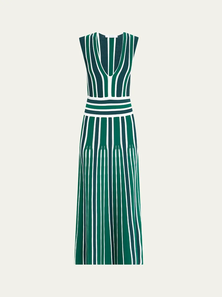 Max Mara "Tallone" dress in striped pleated knit with pointelle details Plunging neckline Sleeveless Aline silhouette Hem falls below the knee Slipover style Viscose/polyester Hand wash Imported
