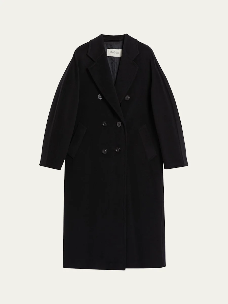 Maxmara Madame coat in wool-cashmere blend. Notched lapel; double breasted button front. Long sleeves. Self-tie sash at waist. Slim A-line silhouette. Midi length. Virgin wool/cashmere. Lining, cupro/viscose/metallic fiber. Made in Italy. Model is 5'10"/177cm. Online Inquiries: BGS21_B4P6A| Store Inquiries: #2818257
