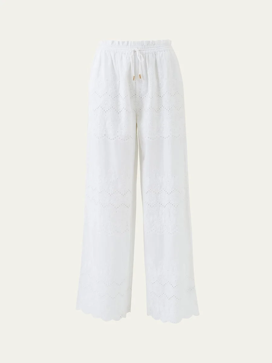 Melissa Odabash "Immy" trousers with eyelet-embroidered detailing and a scalloped bottom edge Mid-rise drawstring waistband Side seam pockets Full length Relaxed legs Pull-on style Cotton Unlined Hand wash Imported Online Inquiries: BGS21_T6MWW| Store Inquiries: #5014259