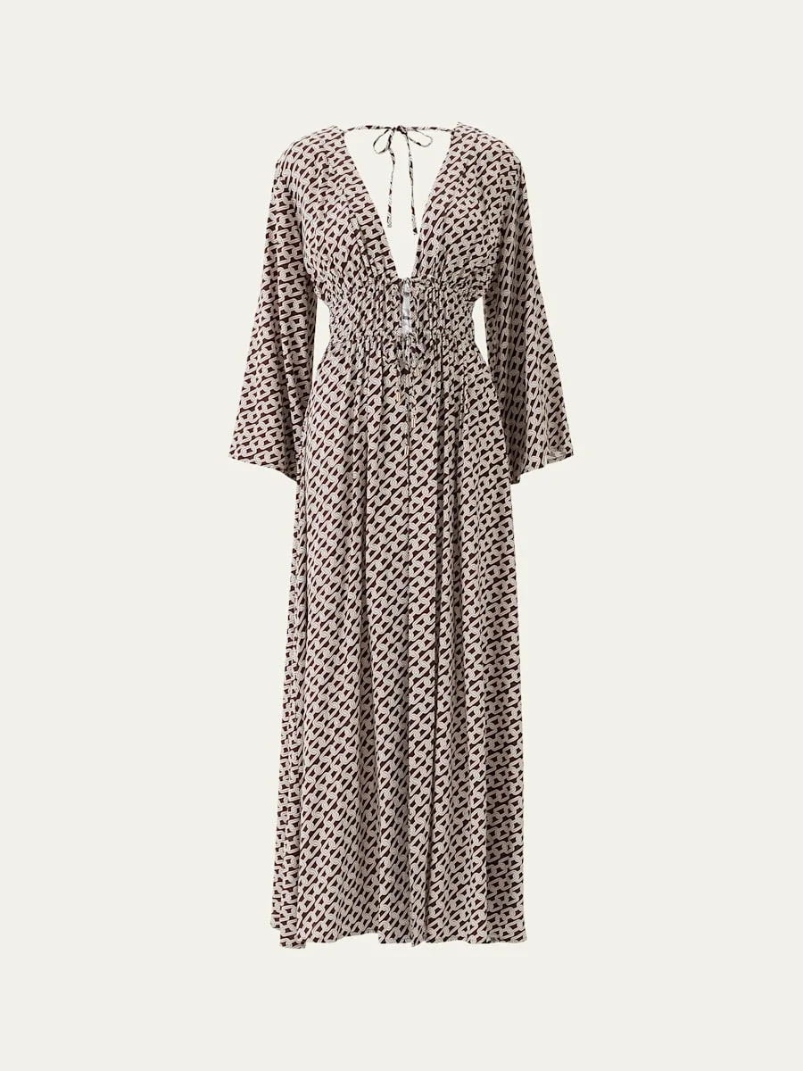Melissa Odabash's "Maja" maxi kaftan features an allover chainlink print V neckline Relaxed long sleeves Full length Double selftie waist Selfties behind the neck Viscose Hand wash Imported