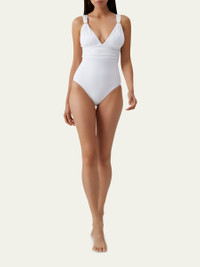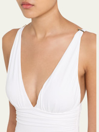 Crafted from premium Italian swim fabric, the "Panarea" onepiece swimsuit by Melissa Odabash is designed to sculpt and define your figure with a skillfully placed ruched underbust panel V neckline Adjustable straps with golden bar trims Fixed triangle cups Moderate seat coverage Nylon/polyamide/elastane Made in Italy