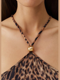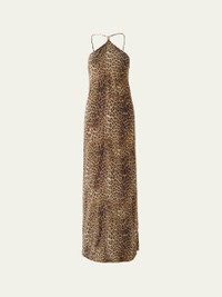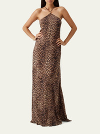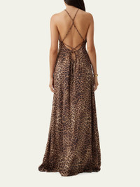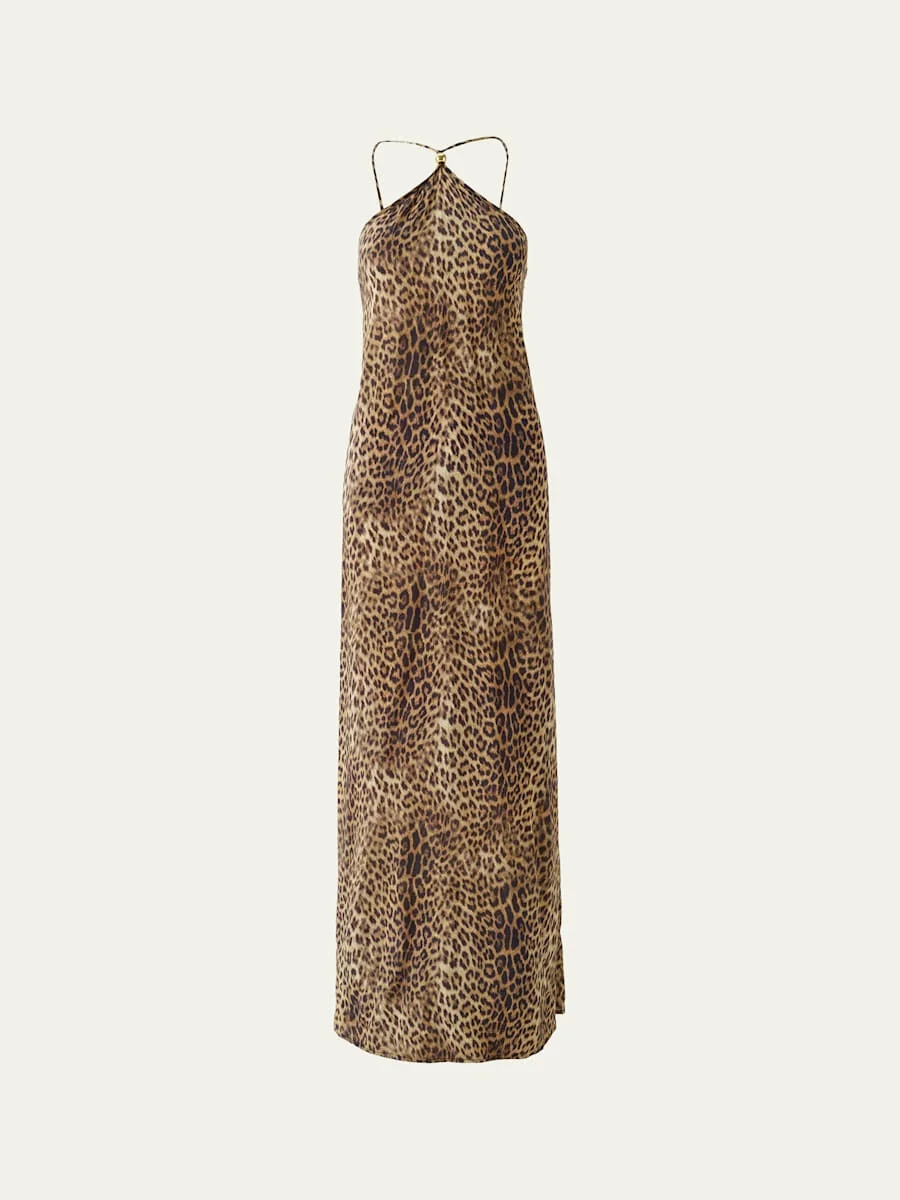 The "Sage" maxi dress by Melissa Odabash features a bold leopard print and golden bead trim at the collar High neckline Sleeveless Full length Aline silhouette Selftie crisscross back straps Viscose Hand wash Trim: Metal Imported