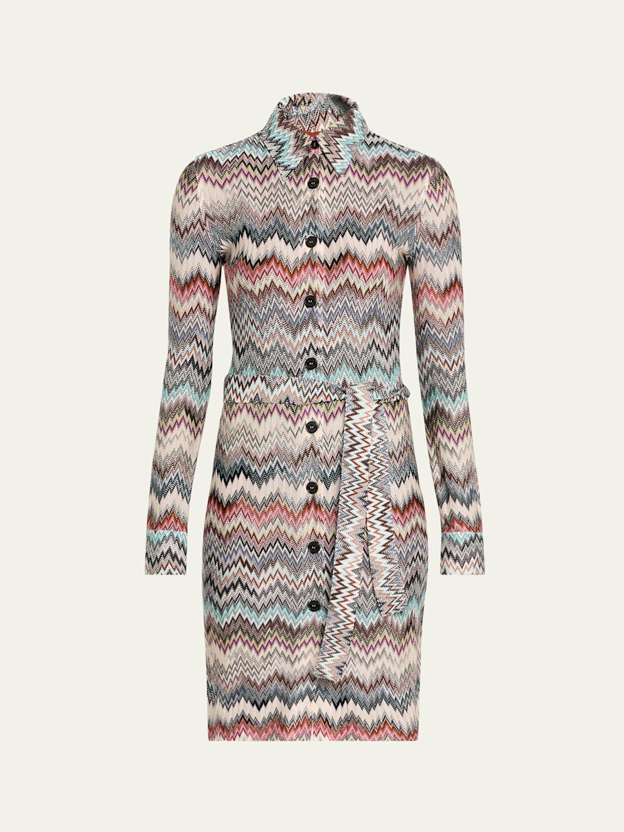 Missoni chemisier shirtdress featuring chevron intarsia and a self waist sash Approx. 100cm from shoulder to hem Point collar; button front Long sleeves; button cuffs Sheath silhouette Knee length Rayon/cellulose acetate Made in Italy Online Inquiries: BGS21_BA3HV| Store Inquiries: #5025158