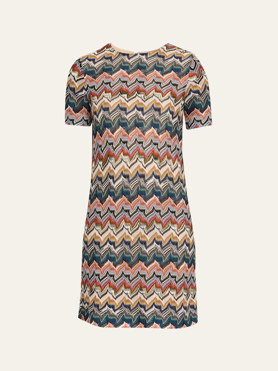 Missoni dress featuring a metallic zigzag intarsia Round neckline Short sleeves Sheath silhouette Mini length Back zip Rayon/cellulose acetate/Lurex® metallic fibers/wool Made in Italy Online Inquiries: BGS21_BA3HX| Store Inquiries: #5025160