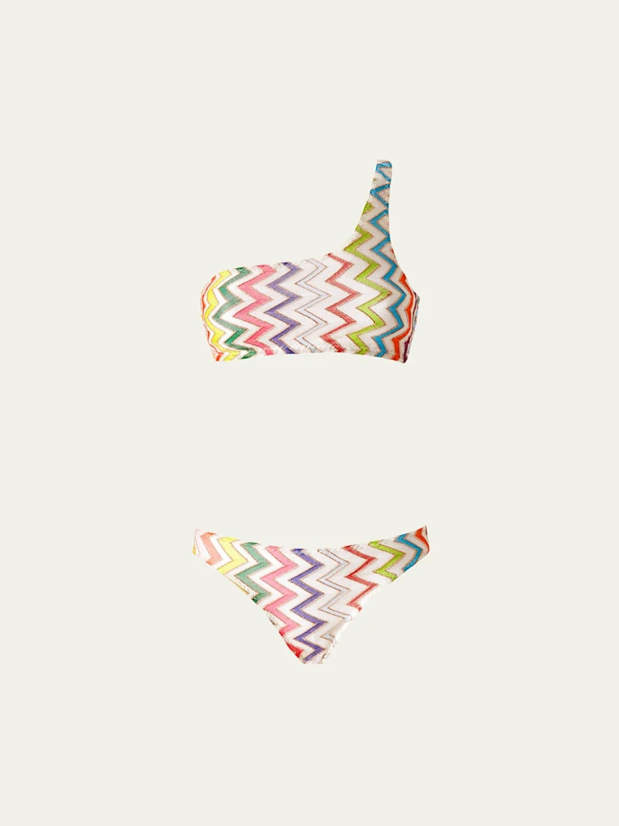 Missoni two-piece swimsuit in the brand's signature zig-zag pattern with metallic detailing One-shoulder neckline Pullover style Low-rise hipster Moderate seat coverage Rayon/cellulose acetate/polyester/metallic fibers Made in Italy Online Inquiries: BGS21_T6Q4D| Store Inquiries: #5023637