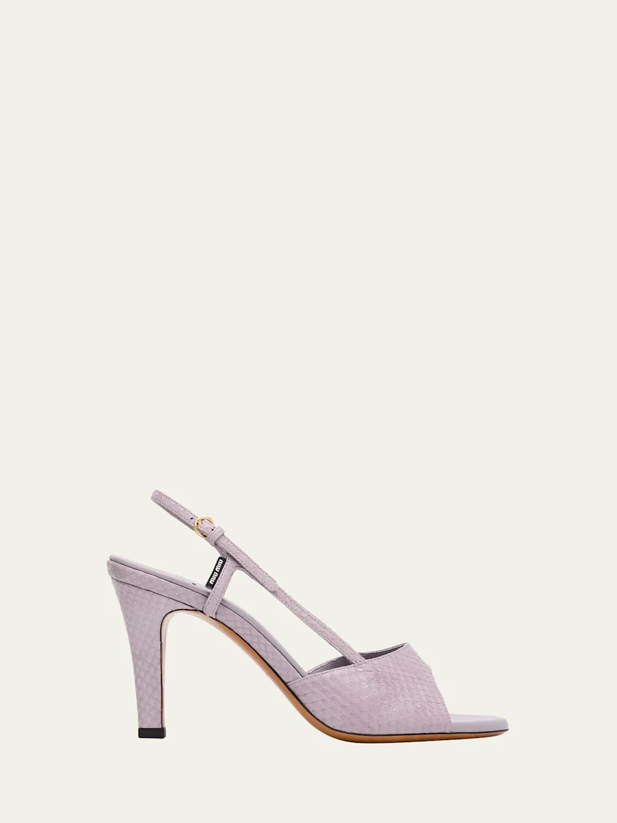 Miu Miu "Ayer" sandals in snake leather 3.25 in / 85 mm stiletto heel Open almond toe Buckle slingback strap Leather lining and outsole Made in Italy