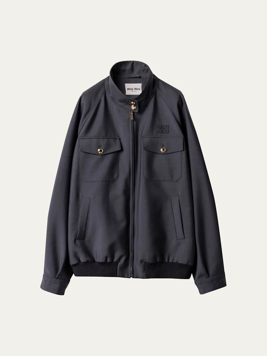 Miu Miu bomber jacket featuring a logo embroidered chest Stand collar; zip front Long raglan sleeves; button cuffs Padded shoulders Chest button/flap pockets Hip welt pockets Oversized fit Ribbed hem Mohair/virgin wool/cotton Made in Italy Online Inquiries: BGS21_BABMF| Store Inquiries: #5074449