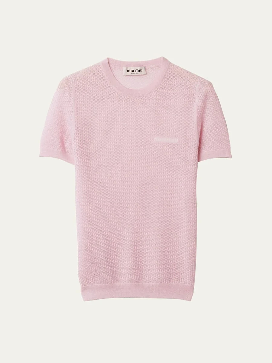 Miu Miu sweater knit from fine cashmere in a lacy motif Crew neckline Short sleeves Intarsia-knit logo at left chest Relaxed fit Hip length Pullover style Cashmere Made in Italy Online Inquiries: BGS21_BA787| Store Inquiries: #5044981
