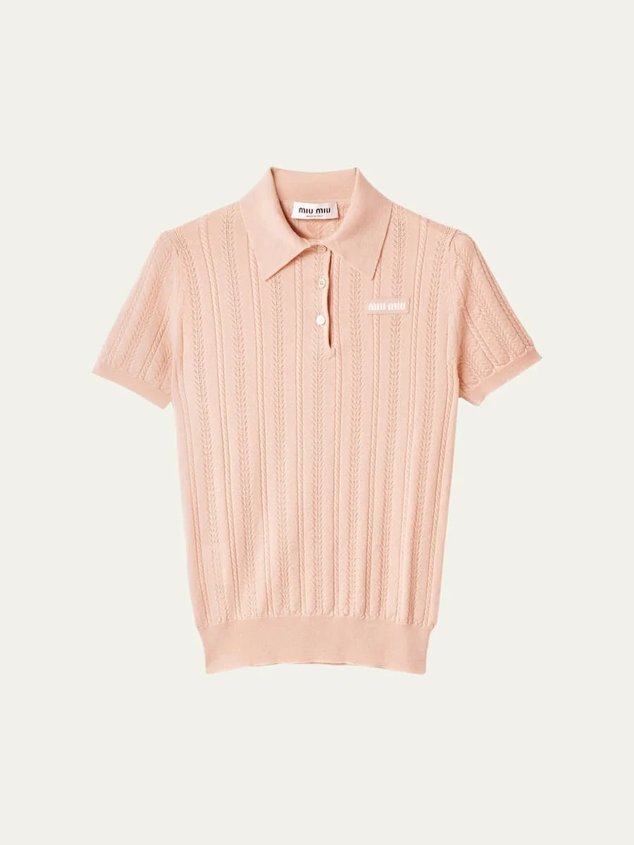 Lightweight and delicate, this Miu Miu polo is finely knit in cashmere with pointelle and cable textures Complete with three mother-of-pearl buttons Spread collar Three-button front Short sleeves Relaxed fit Pullover style Cashmere Made in Italy Online Inquiries: BGS21_BA79N| Store Inquiries: #5045033