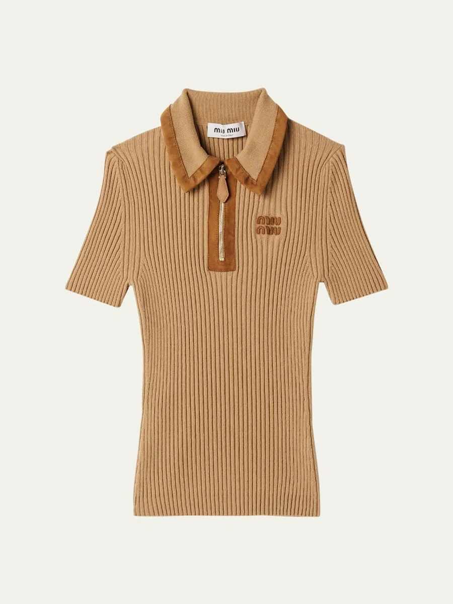 Miu Miu ribbed knit polo shirt featuring lambskin suede trim and a logo embroidered chest Point collar; quarter zip front Short sleeves Fitted Pullover style Cashmere/nylon/polyamide/suede Made in Italy Online Inquiries: BGS21_BA78T| Store Inquiries: #5045004