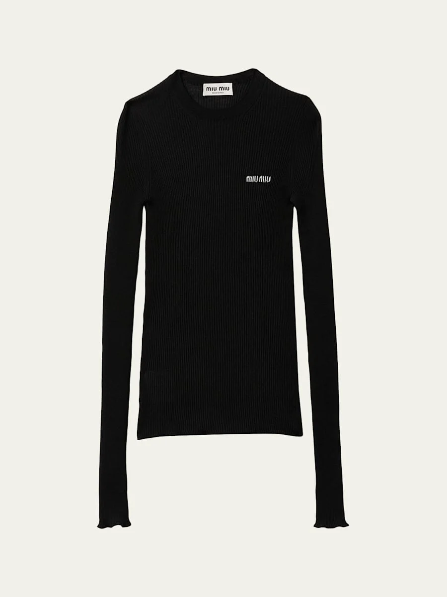 Miu Miu sweater is crafted of a soft cashmereblend ribbed knit featuring a logo check intarsia Crew neckline Long sleeves Fitted Pullover style Cashmere/silk Made in Italy