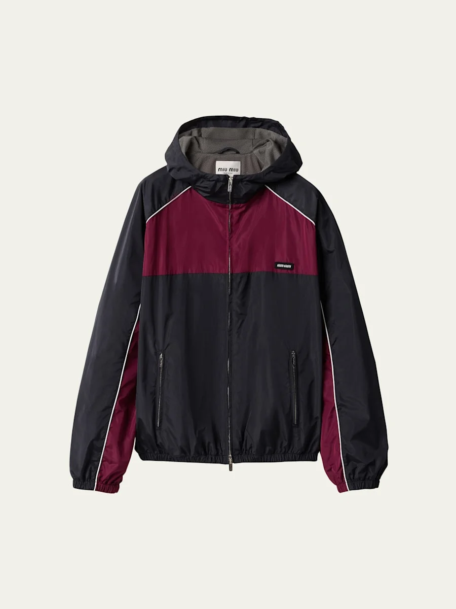 Miu Miu track jacket featuring colorblock panels, contrast piping, and a chest logo patch Drawstring hooded neckline; zip front Long raglan sleeves Hip zip pockets Oversized fit Elasticized cuffs and waistband Polyester/silk Made in Italy