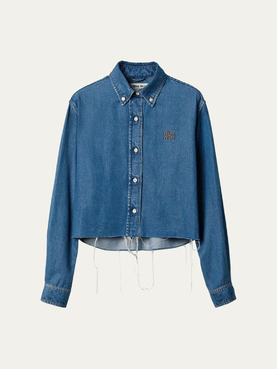 Miu Miu denim shirt with an embroidered logo on the chest Buttondown collar; button front Long sleeves; button cuffs Boxy fit Back yoke; box pleat Cropped length Raw hem Button closure Cotton Made in Italy
