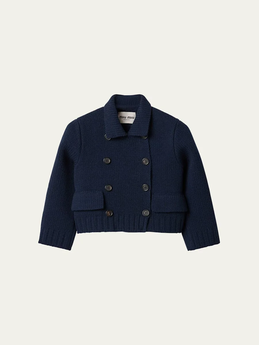 Miu Miu knit jacket with logo lettering applique on the back Spread collar; doublebreasted front Threequarter sleeves Front flap pockets Slim fit Cropped length Wool Made in Italy