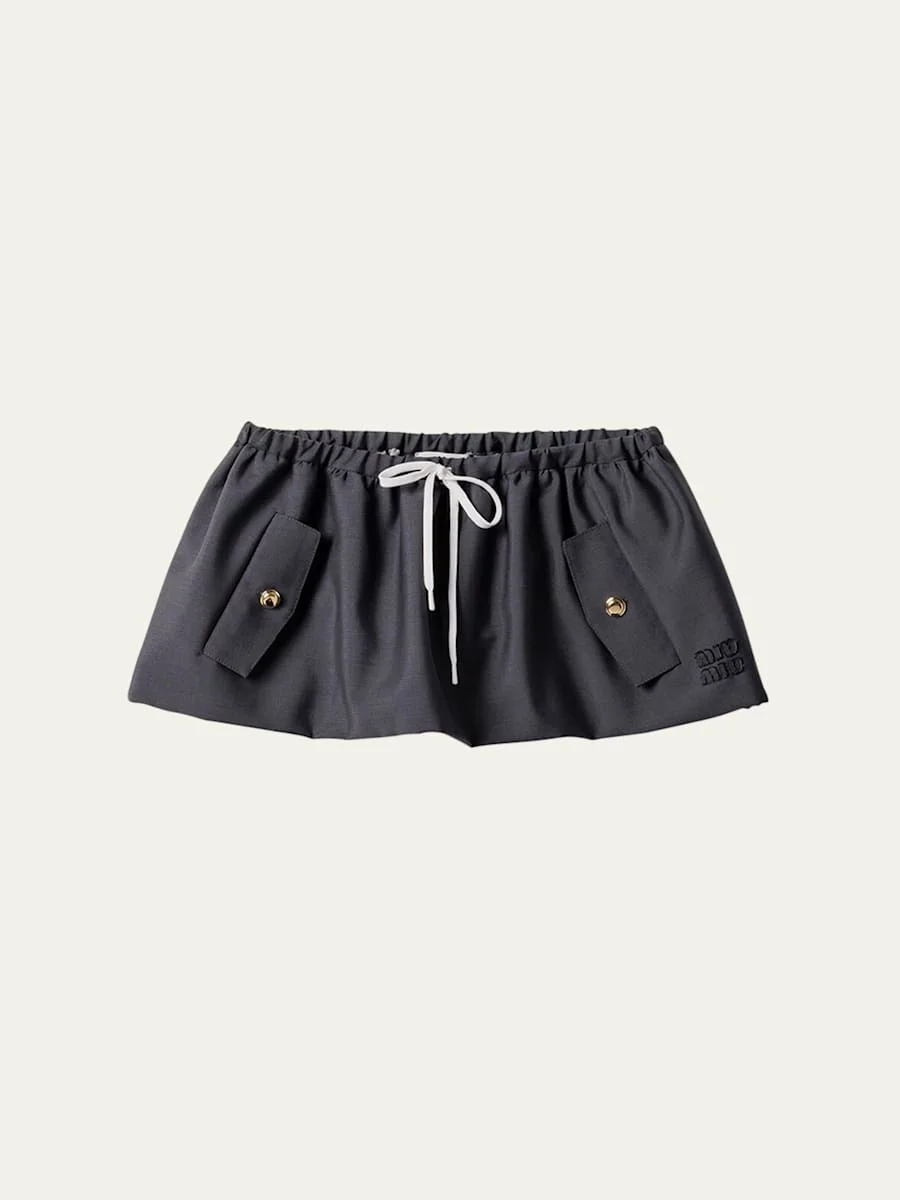 Miu Miu skirt featuring a drawstring waistband and a logo embroidered hem Low waist Hip flap pockets with snap buttons Mini length A-line silhouette Pull-on style Mohair/wool/cotton Made in Italy Online Inquiries: BGS21_BABL9| Store Inquiries: #5074409