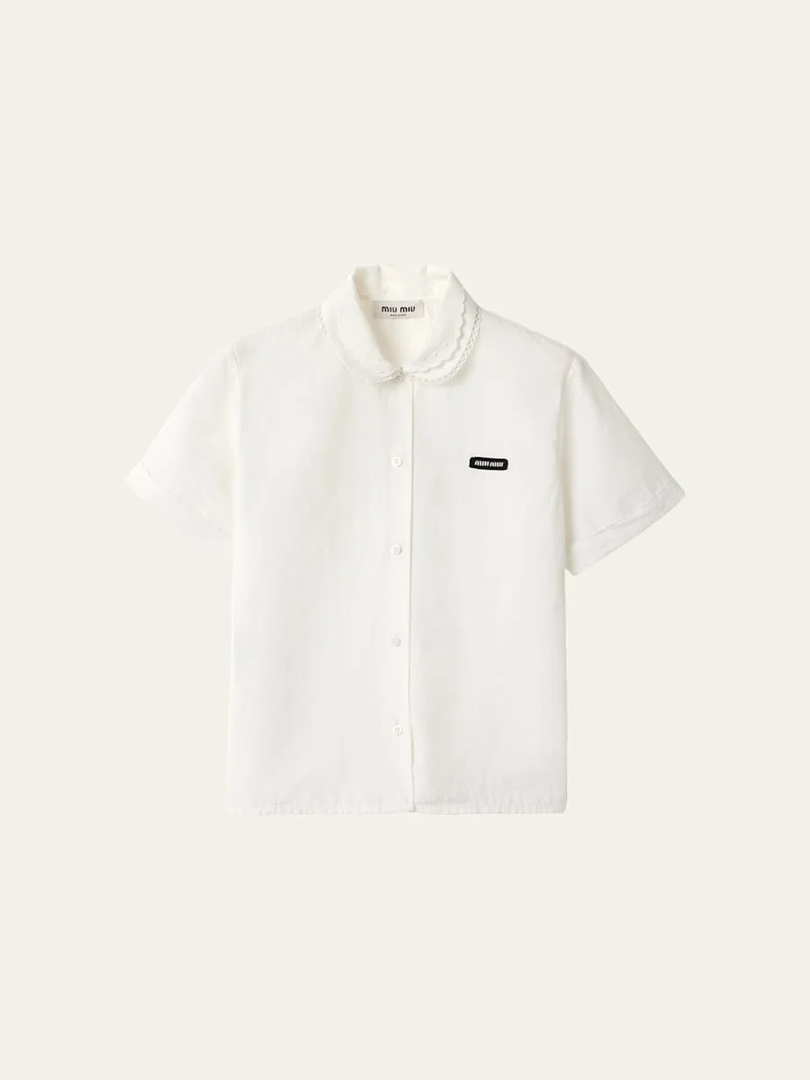Inspired by childrenswear, this poplin shirt by Miu Miu features an overlapping double collar with embroidery and bobbin lace trim on the cuffs Rounded collar Short sleeves Knit logo label at left chest Straight fit Hip length Button front closure Cotton/linen Made in Italy Online Inquiries: BGS21_BB2B7| Store Inquiries: #5452370