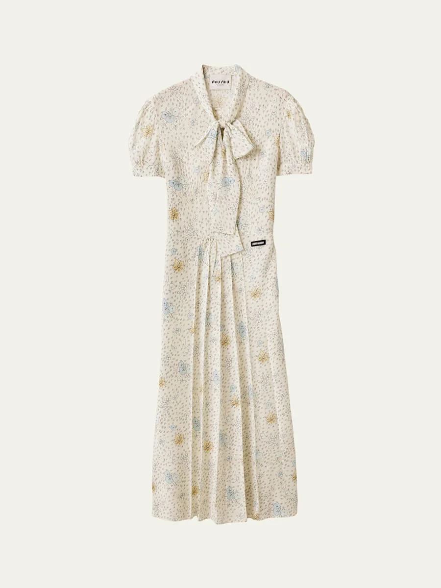 Miu Miu dress featuring a floral print, a neck tie, and waist gathering Shawl collar; self-tie front Short sleeves; button cuffs Logo patch waist A-line silhouette Hem falls below the knee Side zip Silk Made in Italy Online Inquiries: BGS21_BABM8| Store Inquiries: #5074442