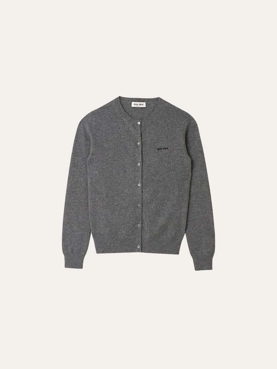 Miu Miu knit cardigan with intarsia logo Crew neckline; button front Long sleeves Slim fit Cashmere Hand wash or dry clean, professional cleaning recommended Made in Italy