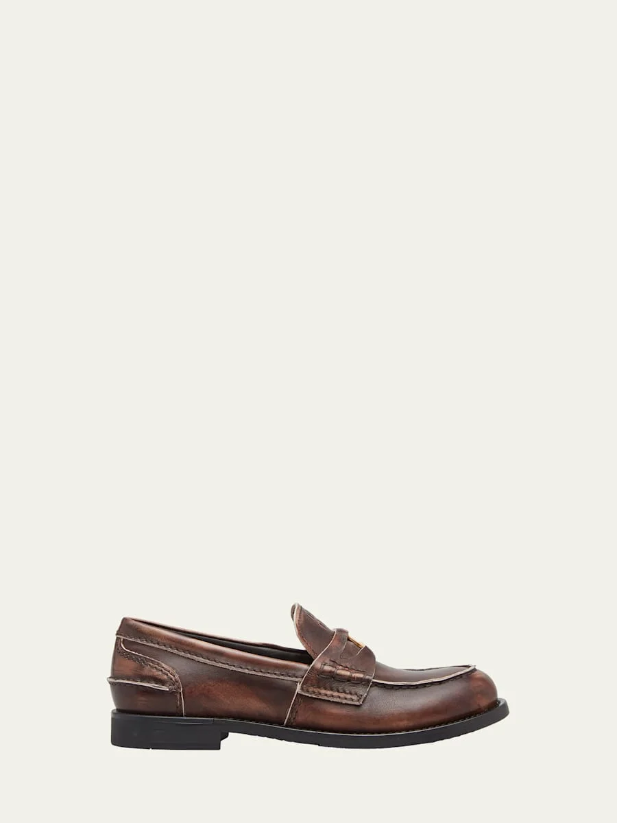 Miu Miu leather penny loafers with golden logo coin accent Flat heel Almond moc toe Notched vamp with keeper strap Slip-on style Rubber outsole Made in Italy Online Inquiries: BGS21_X5TTX| Store Inquiries: #4357929