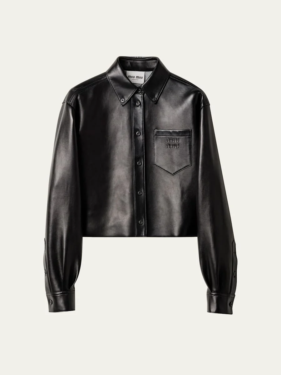 Miu Miu shirt jacket in supple lamb leather with a logo embroidered chest Button point collar; button front Long sleeves; button barrel cuffs Chest patch pocket Boxy fit Cropped length Leather Made in Italy Online Inquiries: BGS21_BAA1R| Store Inquiries: #5066171