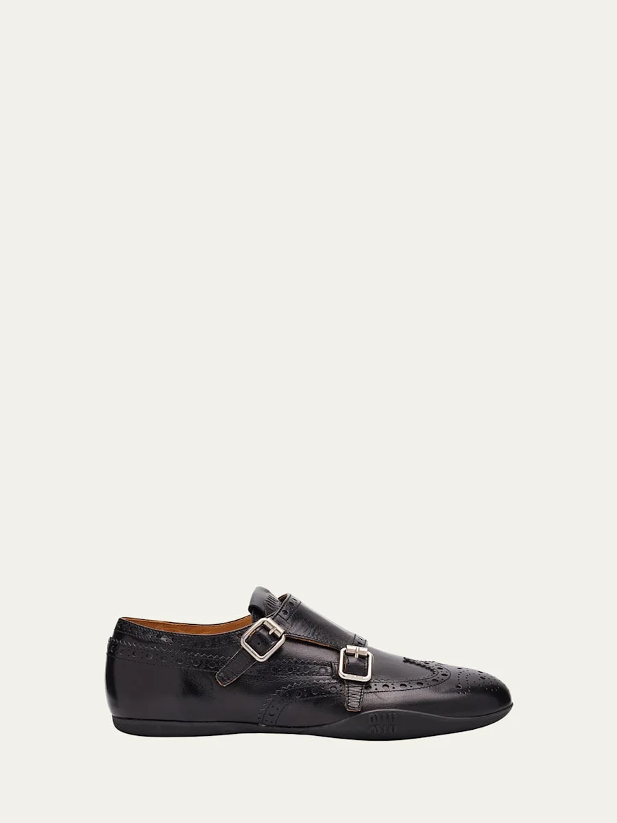 Miu Miu loafers in smooth calf leather with brogue detailing 0.17 in / 5 mm flat heel Round wing-tip toe Double monk buckle vamp Leather lining Thin rubber outsole with embossed logo Made in Italy Online Inquiries: BGS21_X6XZ3| Store Inquiries: #5045923