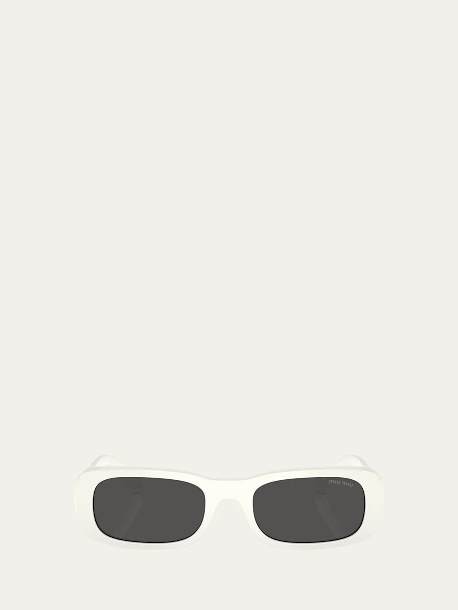 Miu Miu rectangular sunglasses in acetate Lens/bridge/temple (in mm): 5320140 Solid lenses; logo on corner Saddle nose bridge Logo on temples Thin, tapered arms 100% UVA/UVB protection Made in Italy
